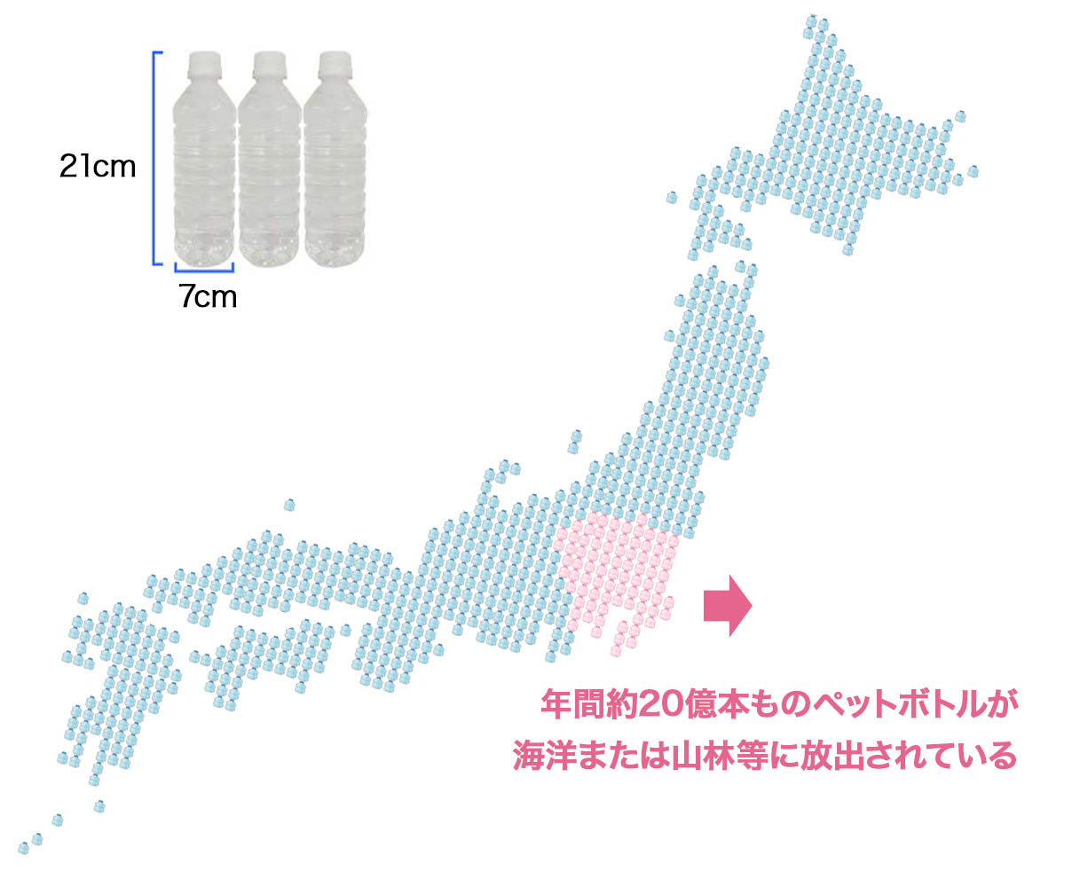 一見高い数字の様に見えますが、問題なのは、回収されていないペットボトルゴミの量が7.5%ですので、29,437km²(210.025億本)となり、これは関東地方(面積32, 420km²)の大半の広さを埋め尽くしたペットボトルが国土または海洋にゴミとして流出している事になります。